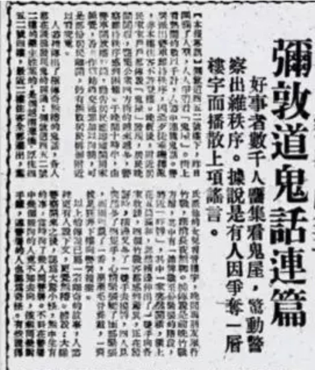 可我们仔细看清这个报纸,会发现地点根本对不上,报纸上显示的是弥敦道,而不是大莆田,这两地相距甚远。不过传出的鬼话是这样的。