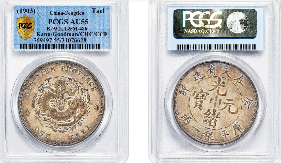 1903年癸卯奉天省造光绪元宝库平银一两银币样币一枚,K-931I/LM-486,奉天制造银圆总局雕模试铸,泉界习称“奉天一两”,彼时因“圆两之争”币制未决,仅试铸未发行;奉天一两样币自光绪三十年(1904)首次见诸公开报导为世人所知,距今近一百二十年孑然一品,遗世独存,毫无疑问位居中国机制币大珍之首;样币雕刻工谨,铸模深峻,底版银光莹亮,颇具类镜面观感,虽设计风格与同时期量产的“圆”制奉天七钱二分银币相类似,但币文楷书更为瘦硬有神,龙身更加粗壮威武,气势恢宏,见之忘俗。上面也有编号也可以登陆网站输入编号进行查看细节。