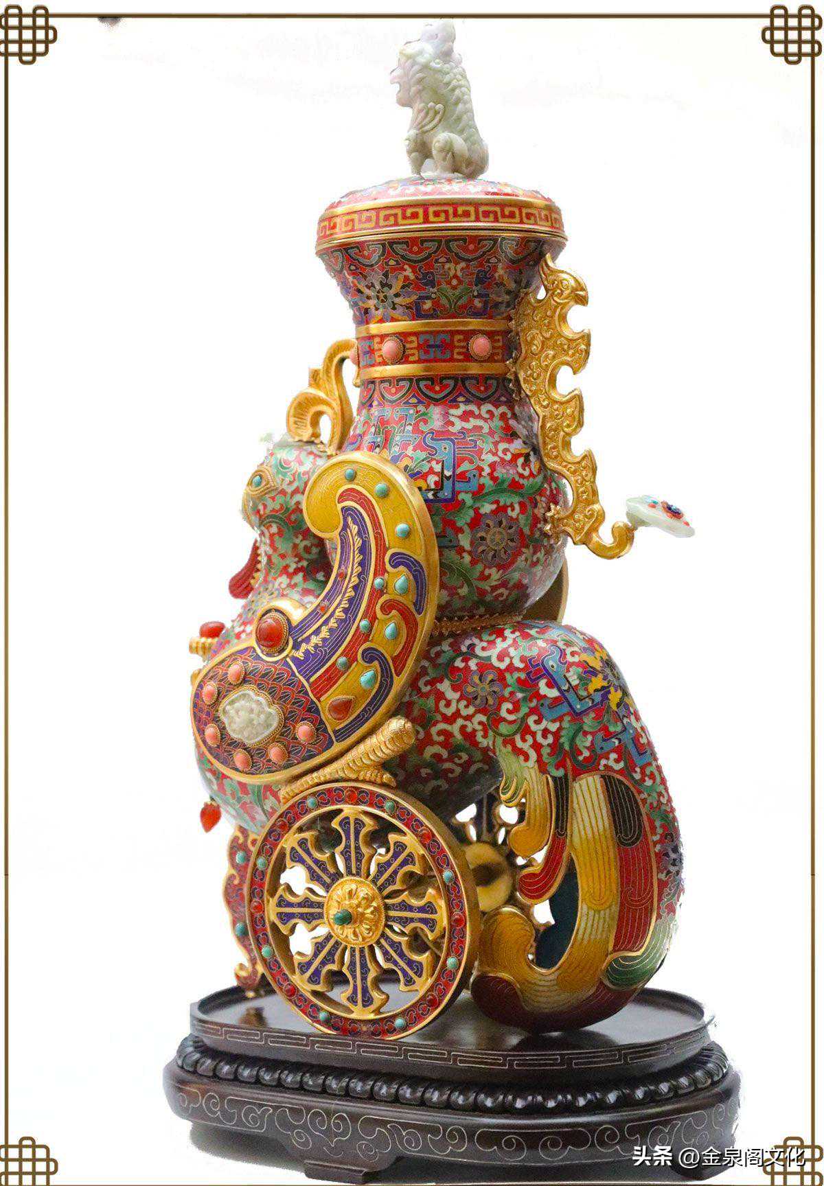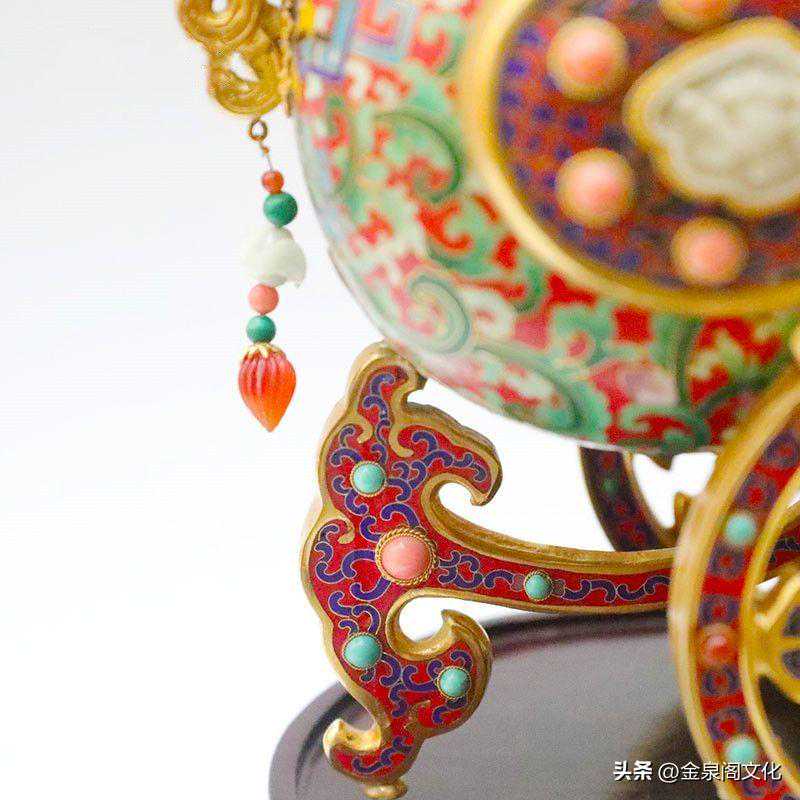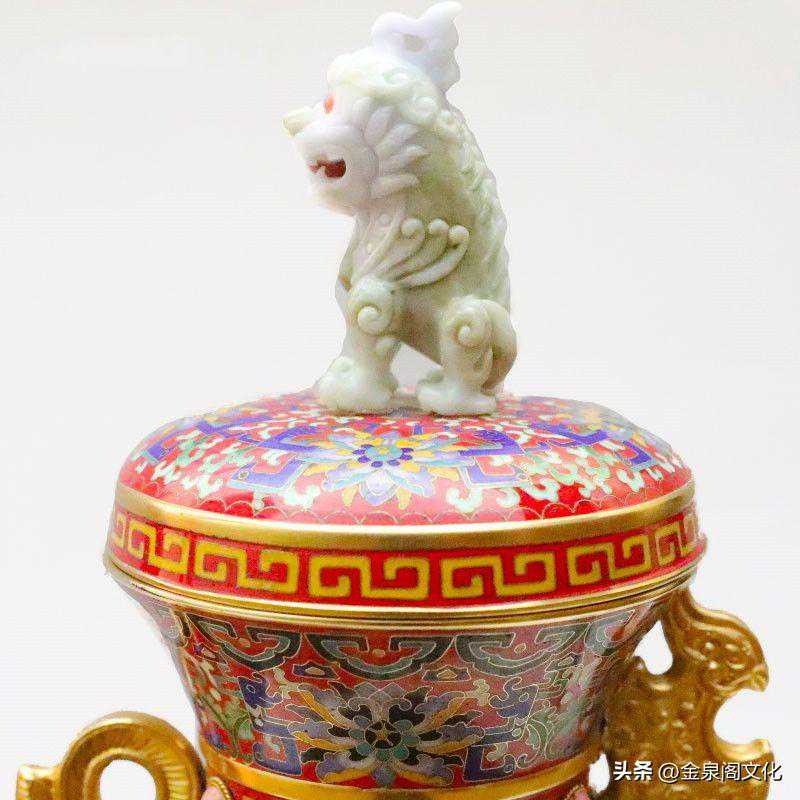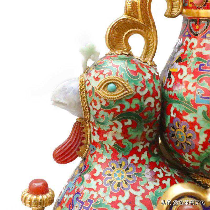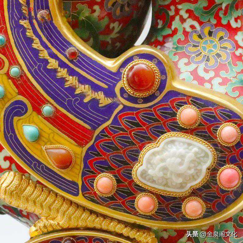 此珍品造型为天鸡凤辇托宝瓶,瓶盖顶端有独角天尊,其花纹为大明拐子龙凤莲纹,其主色调为绿地色,其它为配色。其工艺景泰蓝为主体,瓶顶端独角兽、鸡嘴、鸡翅膀、飞凤、鸡冠、鸡胸坠、瓶、耳如意等都用高档翡和红玛瑙精雕嵌制作而成。珊瑚、松石、玛瑙、青金、孔雀石等嵌制在鸡尊的诸多部位,更显此作金碧辉煌、高雅华贵、玲珑剔透、珠光宝气,极有浓郁的皇家气势。