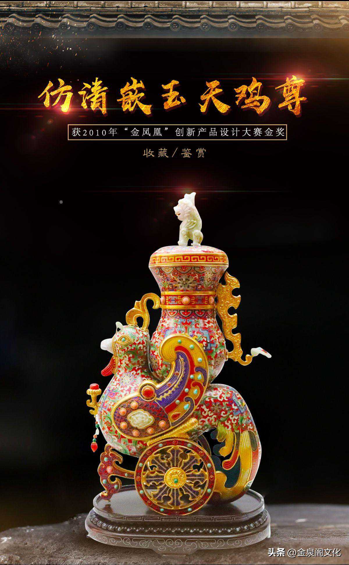 景泰蓝嵌玉天鸡尊高70公分,宽42公分,是刘永森先生从艺60多年的晚年佳作,也是2010年中国第45届金凤凰创新产品设计大奖赛得金奖之后的一姐妹艺术大作,也是他们根据清乾隆宫廷贡品原形体加以继承发展完善,由单一景泰蓝改为多种宝石镶嵌创作出的空前杰作。