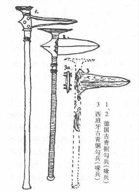 谈及戈是中国古代特有的勾兵,并不是说世界其他各国不存在类似兵器,如德国西班牙也出土有这种锋刃横置于柲的青铜兵器,但却没有像戈在中国这样装备的这么普及,时间跨度这么大。无论是公元前2500的苏美尔军队,还是公元前1200年左右的迈锡尼士兵,抑或公元前1190年左右的埃及军队,从遗留的画面看,矛是普通士兵的常备兵器。此外,在希腊还出土有执盾、斧的重装步兵雕像,但勾兵并不多见。而人民公园期则不然,随葬兵器的墓葬中几乎都出土有青铜戈,且随葬戈的军事人员从平民到贵族,从普通士兵到基层军官皆有,这充分说明了戈在当时商军装备的普遍性。这是中国与其他国家在文明早期的一个区别。