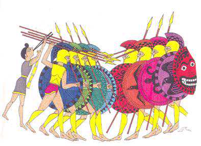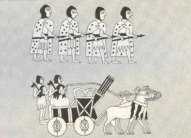 公元前2500年左右,苏美尔(Sumer)的军队。手持长矛的战士戴着头巾,身披战袍。战车兵手持战斧,用于打落敌人刺过来的长矛;左肩披兽皮,起着盾牌的作用。战车为四驴并驱的四轮战车。