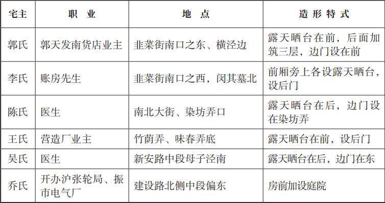 留桥弄内的“凌宅”,北街东、染坊弄南的“黄蕴深宅”,也有简化了的石库门风格。凌宅为三开间两层楼中西式建筑,楼前圈设围墙,中间设石库门,屋后有小花院,也圈设围墙。黄蕴深宅为三开间三层楼中西式建筑,楼前圈围墙设门,后有附房,两层和三层均设露天晒台。