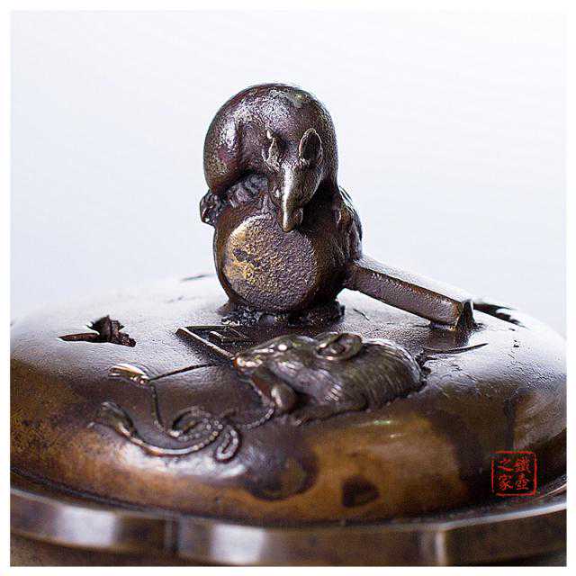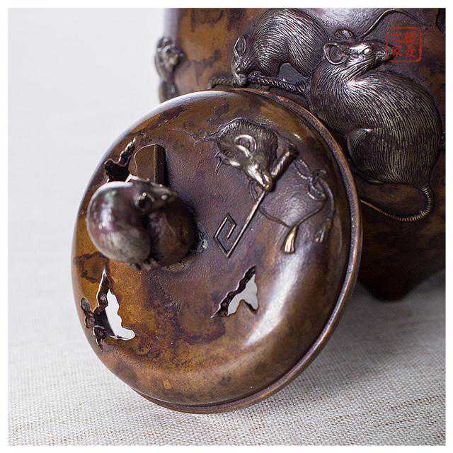 关键词:失蜡法制做成型常言慢工出细活。此款香炉上,老鼠毫厘可见的被毛,以及茶袋系带上灵动飘逸的流苏,都足以证明匠人对其倾注了极大的心血。而这种高精密的纹饰只有采用古老的失蜡铸物发方可成型。