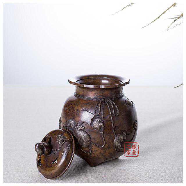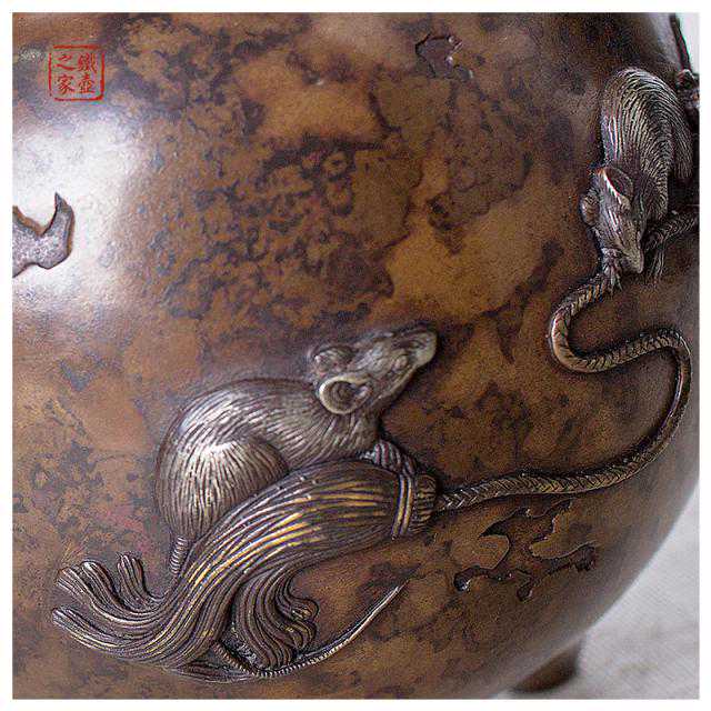 关键词:艺术设计此款金钱鼠福香炉,炉身以茶袋为原型,敦实圆润。秘传的着色工艺让炉整体呈烧色,不规则的斑驳更添一分古朴风韵。而周身的老鼠纹饰,生动细腻,如神来之笔让整个作品立马鲜活起来。