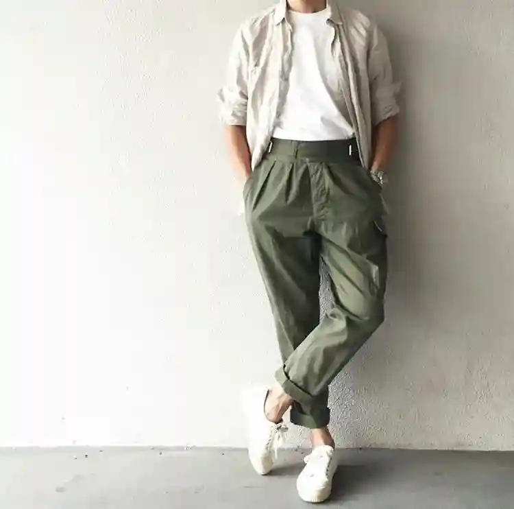 带有收褶工艺的卡其裤,在款式上就显得很抢眼,搭配一件军绿色的棉麻衬衫,这样的色调一般很难驾驭,但是衬衫领口、袖口和裤子腰头的处理让造型也显得自然协调,不会显得刻板。