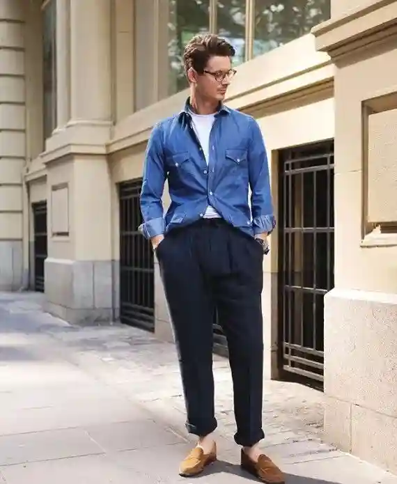相对来说,蓝白色调更加百搭,利用藏蓝色的收褶裤搭配白T,再加上一件牛仔蓝衬衫,整体的色调非常的清新大气,同时造型的层次感也很好,很适合春季的一个组合。