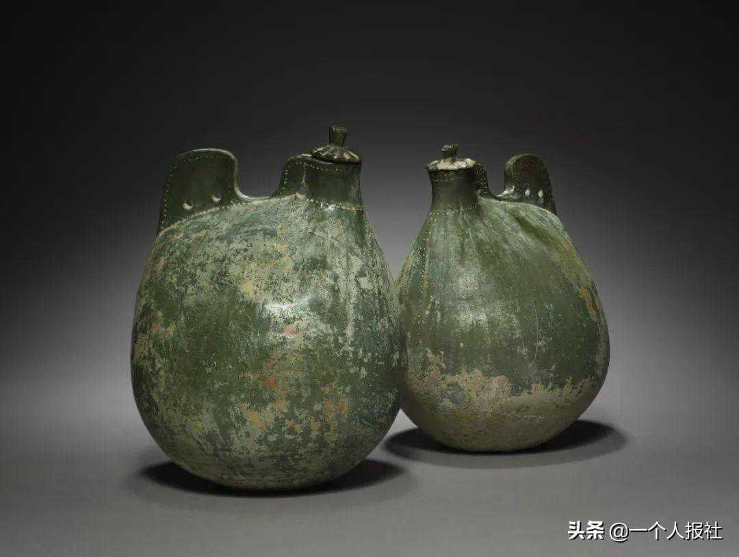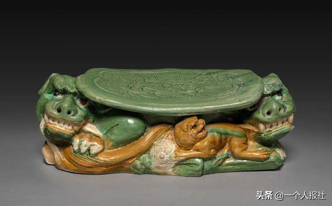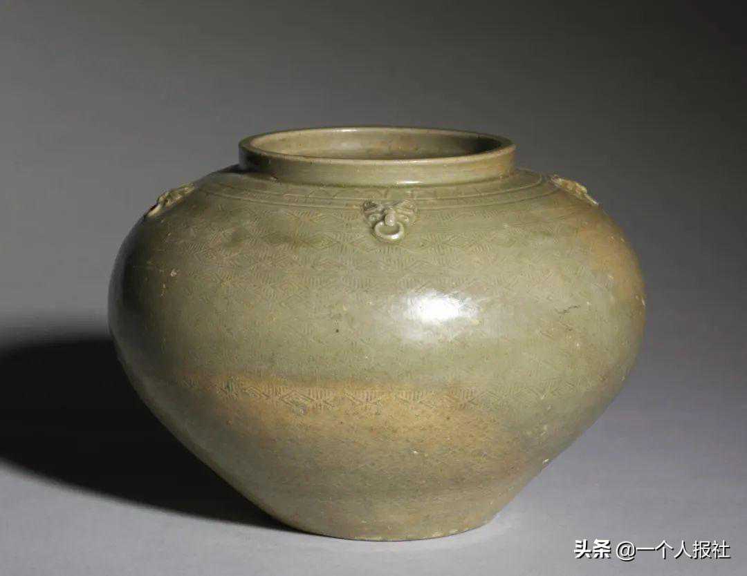造型酷似青铜器,表面覆盖着一层薄薄的棕绿色釉。肩部三层纹饰中前两周为凤鸟纹,第三排的几何纹饰较为少见。早在商周时期(约公元前1600-256年),中国就有了高温烧造的带釉器物。随后陶工们获得了有关釉料中金属氧化物与窑气之间反应以改变釉料颜色的实用技术知识。