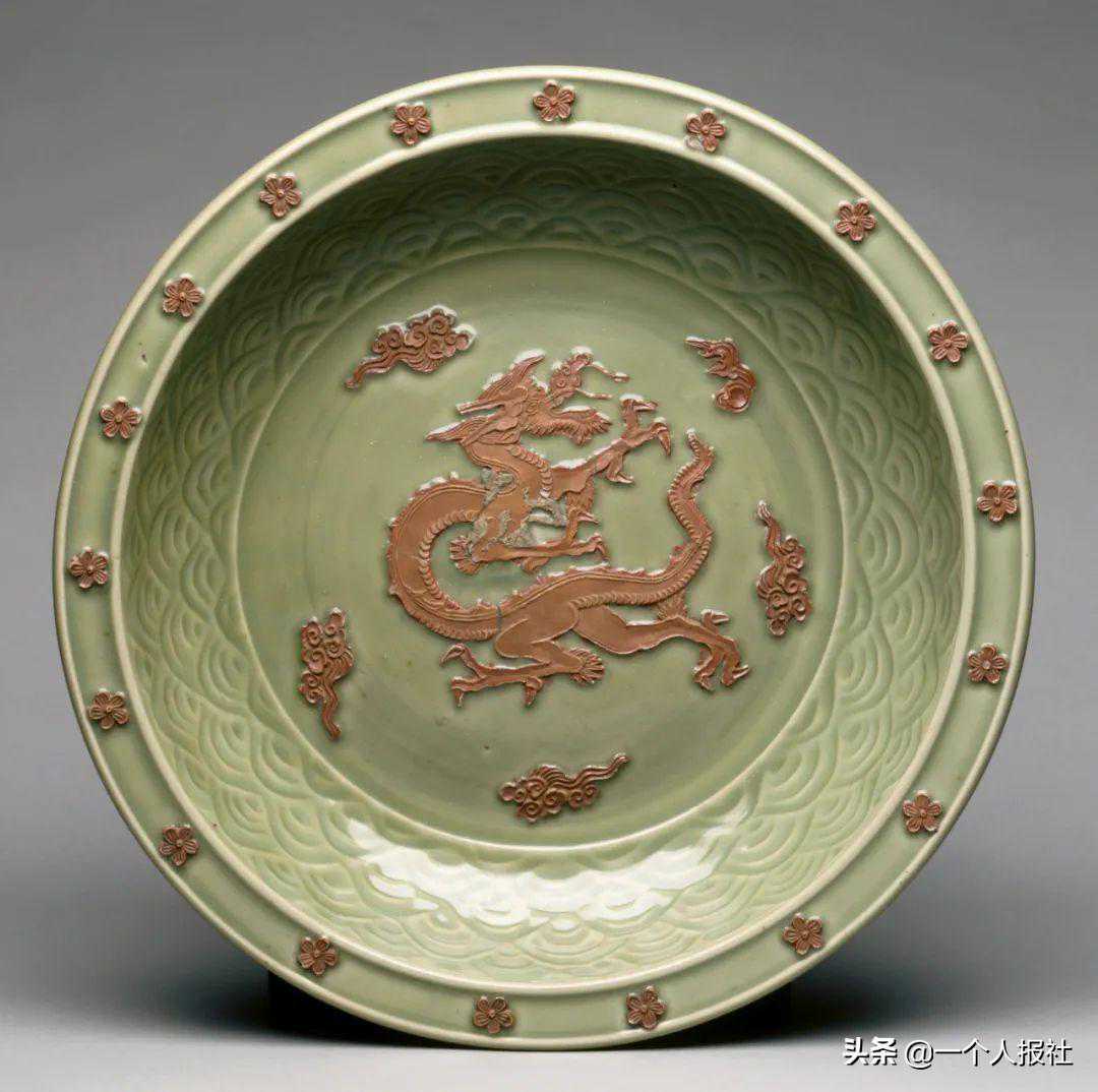 元龙泉窑青釉露胎贴塑云龙纹盘