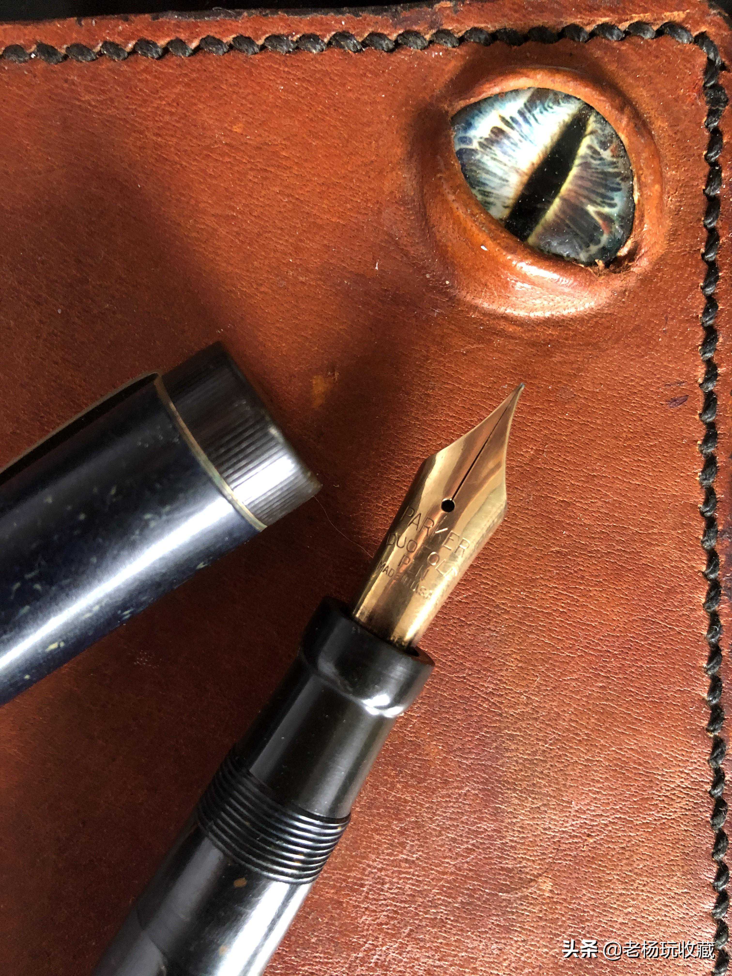 对于古玩金笔的收藏,老杨的标准的第一标准,就是金笔尖。第二标准就是老。上图这只派克多福,约为1931至1940年所生产,想对现代的钢笔,笔杆略粗。可惜的是笔帽上的双环,损坏遗失了一环。派克多福系列,应该是老派克金笔收藏里,不得不玩的一个系列了,其颜色丰富,老杨也仅有这只黑色的。